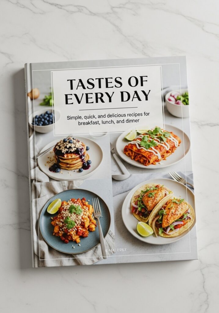 • Recipes include meats, seafood, and vegetarian options.